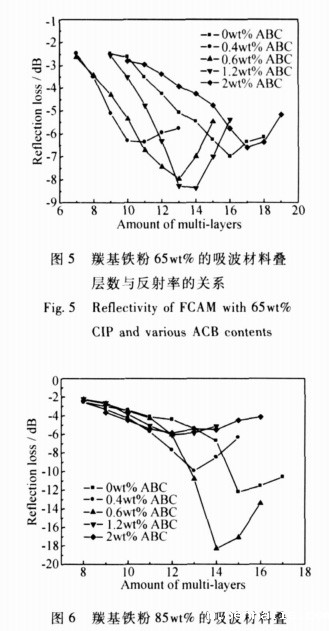 221乙炔炭黑含量对材料吸波性能的影响吸波涂料中羰基铁粉含量一定时,改变乙炔炭黑含量,制备不同乙炔炭黑含量的无纺布吸波材料。图5为羰基铁粉65w%t不同乙炔炭黑含量无纺布叠层吸波材料的反射率曲线。可以看出,在935GHz,随着乙炔炭黑含量的增加,吸波材料的反射率曲线有一个先左后右的移动过程,每条曲线的反射率峰值有先降低后升高的趋势,说明存在某一乙炔炭黑含量使材料的吸波性能佳,微量乙炔炭黑的加入使同一反射率下吸波材料的厚度降低。此外,叠层数大于11层后曲线的反射率可降至-6dB以下。图5中羰基铁粉65wt%,乙炔炭黑06w%t左右时材料的吸波效果较好,此时的吸波材料在厚度为227mm时的反射率为-86dB。图6为羰基铁粉85w%t吸波材料的反射率曲线,也有以上的类似规律。表1和表2分别为图5中和图6中各组试样对应的单层面密度和厚度,这种无纺布吸波材料面密度较小,单层面密度在02kg/m2左右。2羰基铁粉含量对材料吸波性能的影响吸波涂料中乙炔炭黑含量一定时,羰基铁粉含量分别为65w%t,75w%t,85w%t。图7和图8分别是乙炔炭黑为06w%t和12w%t时不同羰基铁粉含量的无纺布叠层吸波材料的反射率曲线。从图7可以看出,随羰基铁粉含量的增加,反射率曲线有下移的趋势,反射率峰值降低,叠层数大于11层后每条曲线的反射率可降至-6dB以下,羰基铁粉85w%t,乙炔炭黑06w%t的试样在厚度为223mm时的反射率为-119dB。