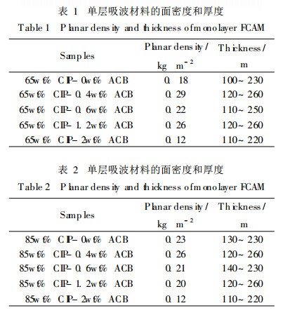 本工作以无纺布为试验基材,制备无纺布织物涂层吸波材料,研究935GHz(测试仪器的中心频点,具有代表性)时吸波剂含量变化和内部结构调整对无纺布吸波材料吸波性能的影响。1试样制备与试验方法11原料试验基材为无纺布;某种水性粘结剂;丙酮;OP;LDT-20羰基铁粉,陕西兴化化学股份有限公司羰基铁粉厂;乙炔炭黑,粉状,北京市欣奕搏瑞化工厂。12试样制备丙酮作溶剂,加适量分散剂OP将不同比例的吸波剂(羰基铁粉和乙炔炭黑)分散均匀,超声处理10min,或研磨机研磨2~3次后,加入水性粘结剂中制成吸波涂料。无纺布经100去离子水浸泡1h前处理以除去表面可能残留的胶浆类物质,将各种不同比例吸波剂含量的吸波涂料调整至适当粘度,均匀刷涂于无纺布上,室温固化,即得各组无纺布织物涂层吸波材料(以下简称无纺布吸波材料或吸波材料)。