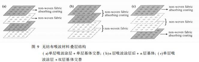 因此这个厚度范围可看作电磁波与吸波材料的有效作用厚度,可以通过调整复合吸波剂的比例降低这一有效作用厚度。以上分析了复合吸波剂含量对材料吸波性能的影响,下面从研究多层吸波材料结构的角度出发,采用了不同的叠层结构,分析吸波材料内部变化对入射电磁波的影响。23不同叠层结构对材料吸波性能的影响为了研究吸波材料内部结构对吸波性能的影响,选取吸波能力较好的无纺布吸波材料,在简单叠层结构中穿插不具有吸波能力的无纺布基体,按照不同的叠加顺序(图9):(a)为(单层吸波涂层+单层基体)交替结构;(b)为(n层吸波涂层后+n层基体)结构;(c)为(单层吸波涂层+双层基体)交替结构,研究不同无纺布叠层结构的吸波性能。图10为三种无纺布吸波材料不同叠层结构的反射率曲线。可以看出,(单层吸波涂层+单层基体)交替结构的吸波效果优于(n层吸波涂层后+n层基体)结构。同时,排列方式为(单层吸波涂层+双层基体)交替结构的吸波效果优于(单层吸波涂层+单层基体)交替结构,说明吸波材料内部结构的改变可以增强其吸波能力。此外,每条(单层吸波涂层+双层基体)交替结构的反射率曲线都有一明显的峰值(反复测量),表明在这一厚度下反射率小,吸收损耗大,说明这种结构的吸波材料在此厚度下的吸波能力得到了充分发挥,如图10a(单层吸波涂层+双层基体)中交替结构的反射率曲线峰值为-118dB,吸波涂层层数大于6层后可使反射率降至-5dB以下。