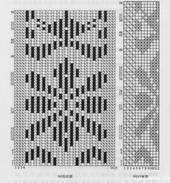 如图2-9(a)所示为某经提花织物的组织图,如图2-9(b)所示为某经提花组织的纹板图,综框1-4操纵织物的地经纱形成平纹地组织,综框5~12操纵织物的提花经纱。织物上的花纹对称;在织物的花纹部位,地经纱和花经纱排列比为1:1,由于花型对称,穿入综框5的花经纱将分别位于花纹的左右两侧,并和地部的经纱交界。为了保证花纹的轮廓清楚,花地交界处的经纱应该具有“相切”的组织关系。从图2-9中可以看出,穿入综框2或综框4内的地经纱和穿入综框5内的花经纱,在纬纱5、6、10、11、13、14、20、21、30、31、33、34、40、41、46、47、52、53等9个部位具有“相切”的组织关系;而综框l或综框3内的地经纱和综框5内的花经纱,仅在纬纱l、2,24、25,44、45,50、51,56、1等5个部位具有“相切”的组织关系。为了预防经纱在花地交界部位发生移位织疵,因之宜采纳由综框2或综框4内的地经纱和综框5内的花经纱构成交界配合。