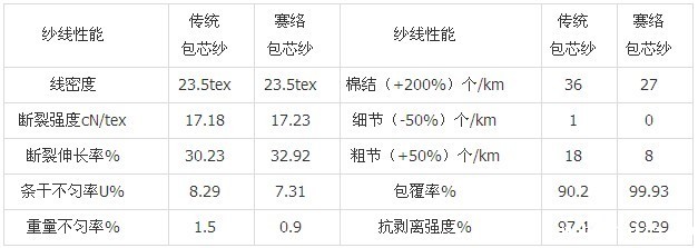 传统包芯纱是加装了包芯纱装置的细纱机上纺制的,而赛络纺包芯纱在加装了包芯纱装置和赛络纺装置的细纱机上纺制。传统包芯纱的外包纤维密集度比较均匀,外表有毛羽。赛络纺包芯纱的外包纤维有两个密集区,芯丝始终位于股纱中心,成纱外表完洁,单纱条和纤维的螺旋线明显,纤维的抱合力高,成纱断裂强度增加,伸长度增大,其条干均匀度也优于传统包芯纱,纺纱线手感柔软,毛羽少,耐磨性能好。