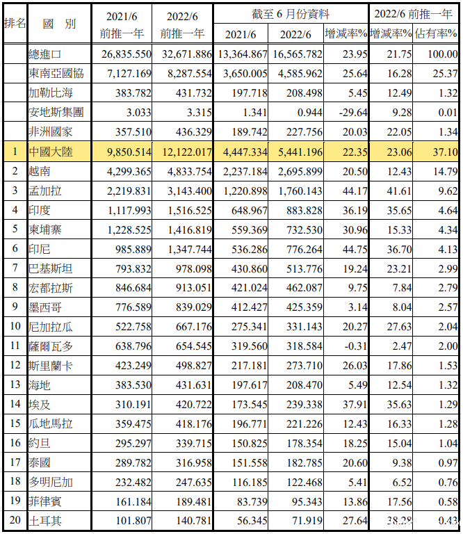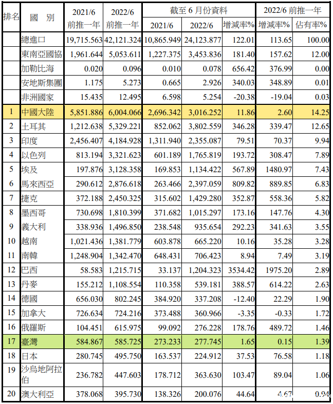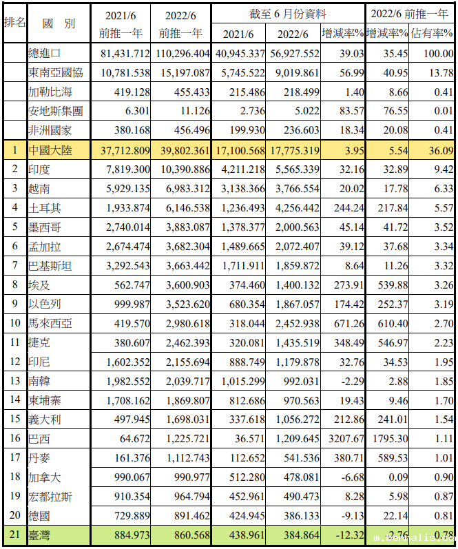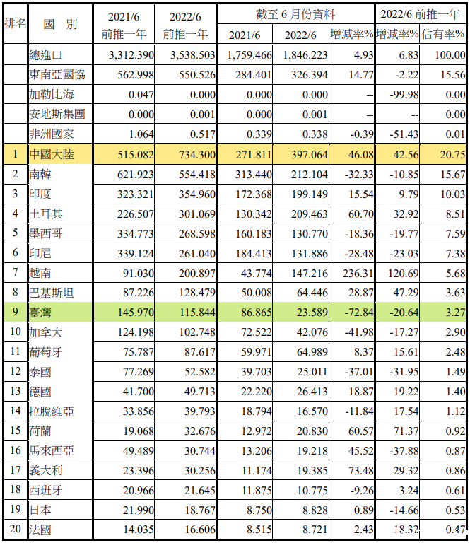 注:依2022年6月前推一年进口占有率排序