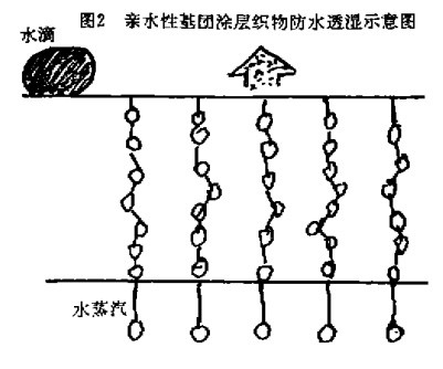 此法先制成一个微孔性的薄膜,然后与织物复合。聚四氟乙烯微孔薄膜是用特殊加工方法制得的。先台成高结晶的颗粒,而后在390—400℃的高温条件下,纵横双向同时给于均匀一致的拉力,迅速拉伸成薄膜。厚度为20—25m,微孔直径大为0.2u,孔径密度达13.95亿个/厘米。聚氨酯微孔结构薄膜也用上述相似原理制造,其微孔直径为0_u,孔径密度约1.55亿个/厘米t。本方法适合于复合涂层的薄膜复贴在纺织品。其透湿性取决于薄膜的质量具有高透湿、高防水性能t但制造薄膜的技术难度相当高,成本昂贵。4高亲水基团的化学透湿法这是一种非微孔性的薄膜材料。这种透湿水滴圈2亲水性基团涂层织物防水透湿示意图涂层的关键特征是在聚氨酯大分子结构中含有足够量的高亲水基,作为水蒸汽移动的阶梯。水蒸汽通过吸收、扩散、解吸等物理作用透过薄膜。