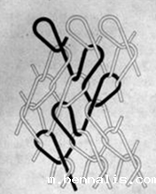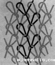 在经平组织中,同一根纺纱线所形成的线圈交替排列在相邻两个纵行线圈中。织物的正反面都呈现菱形的网眼,由于线圈呈倾斜状态,织物纵、横向都具有肯定的延展性。它大的缺点是逆编结方向简单脱散,当一个线圈断裂时织物易沿纵行分别成两片。
