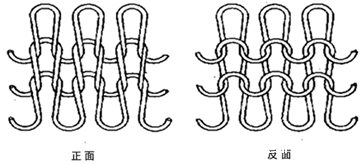 它是由正面线圈横列和反面线圈横列交替配置而成。在织物的两面都呈现纬平组织反面的外观。双反面组织由于圈柱面的倾斜,使织物纵向缩短,增加了织物的纵密和厚度。织物纵向具有较大的延伸性和弹性,但简单沿顺(或逆)编结方向脱散。双反面组织织物手感厚实,保暖性好。