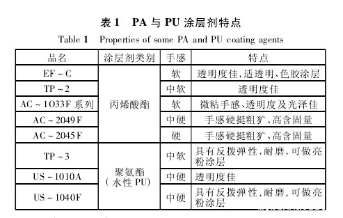 聚丙烯酸酯类(PA)和聚氨酯类(PU)涂层剂是目前常用的涂层剂。PA涂层剂具有黏着力强,不易泛黄,透明度高,共容性好和成本较低等优点,可生产有色涂层产品。其产品耐日光、耐气候牢度和耐洗性好,但存在织物弹性差、易折皱,表面光洁度差,手感欠佳等缺点。PU涂层剂具有柔软、弹性好、涂层强度高、耐磨、耐湿、耐低温和耐干洗等特点。如果在涂层上进行微孔加工,织物还能兼备防风、防水和防污性能,且透湿和透气性好,但其成本较高,耐气候性差,遇水、热、碱会发生水解等问题。表1列出了PA和PU涂层的主要特点。