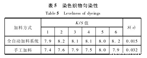表4表明,自动加料系统由于称量精确和加料均匀稳定,减少了人工称量误差,由此避免了由人为操作引起的缸差,使织物具有较高的符样率,染色重现性比传统后工加料好,提高了染色一次成功率和产品质量。