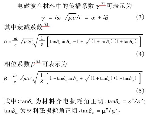 将不同比例的吸波剂( 乙炔炭黑,羰基铁) 加入稀释剂 DMF-甲苯和分散剂 OP-7 中,用 JB500D 电动搅拌机搅拌 10 min,加入黏结剂 PU( 固含量为30% ) 再用电动搅拌机以 1 500 r / min 的速度搅拌60 min,制成吸波涂料。将不同比例吸波剂的吸波涂料调至适当黏度,利用涂层小样机在铜镍镀层布和金属纱线混纺织物上涂覆相应的厚度,在 HD101A 电热鼓风烘箱内固化。多次涂覆以达到理想厚度,即得所需的吸波涂层面料。设计的单 层 吸 波 体 的 结 构 模 型 如 图 1所示。模型中基布作为电磁波屏蔽材料,视为理想导体,使得基布和涂层边界只有反射而无透射。吸波涂层面料吸收电磁波的基本要求是满足阻抗匹配原则和大化衰减原则,输入阻抗公式是建立在基布图 1 吸波涂层面料结构模型可被看作理想导体的前提下的,根据电磁波传输理论,单层吸波材料与空气形成界面的反射率 式中: d 为吸波材料的厚度; λ0为电磁波在真空中的波长或电磁波在自由空间的波长; ε'和 ε″为相对复介电常数的实部和虚部; μ'和 μ″为相对复磁导率的实部和虚部。电磁波在材料中的传播系数 γ利用式( 1) ~ ( 5) 吸波体传输线理论和多目标优化计算的方法,开发了吸波材料的优化设计软件,可在软件中导入吸波粉体和黏结剂电磁参数 ε'、ε″、μ'、μ″建立数据库,输入预期的涂层厚度、层数和损耗介质混比。