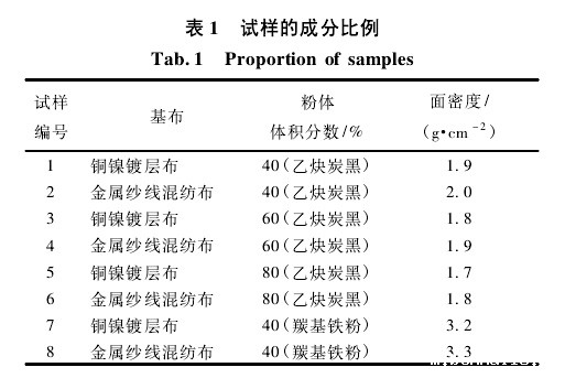 于名讯等以仿抄纸装置及湿法纺织工艺,制备厘米波/毫米波兼容隐身湿纺织物,研究了隐身湿纺织物在 8 ~ 12 GHz 和30 ~ 40 GHz 频段的吸波性能。E. Tan 等讨论了以陶瓷纤维为基布,碳化硅为基体的不同组合的多层织物和不同氧化程度对织物吸收电磁波能力的影响,认为在千兆赫范围内,织物有很好的减少反射和传递的效果,可吸收 90% 以上的电磁波。针对铁纤维的吸波性能和可纺性能,研究了其微观形态、力学性能及摩擦性能,预测铁纤维吸波材料顺利纺纱的可操作性。本文以铜镍镀层布和金属纱线混纺布为基布,利用其面密度低,厚度薄,柔性好等优点,通过在基布上涂覆吸波剂,重点研究了吸波粉体混比的变化及基布对涂层面料吸波性能的影响。