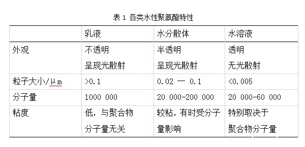 根据分子粒子在水中的分散程度不同,水性聚氨酯分为乳液、水分散体、水溶性等3种,表1列示了3种水性聚氨酯的特性。